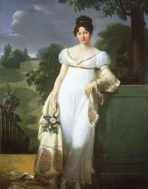 During the early nineteenth century, high-waisted outfits were in vogue. The "Empire design" had been made famous by French Emperor Napoleon's wife Josephine Bonaparte. The empire gown has a fitted bodice closing just underneath the bust, offering a high-waisted look, and a gathered skirt which is long and loosely fitting but skims the body in the place of becoming supported by voluminous petticoats.