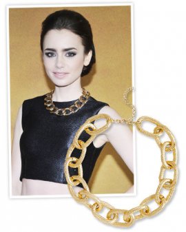 Influenced by: Lily Collins. Elevate a typical gown with a chunky chain-it’s really a declaration necklace without features. If the gold equipment seems too one-note available, try a two-tone enameled one for the extra oomph. Nasty Gal, $20; nastygal.com.