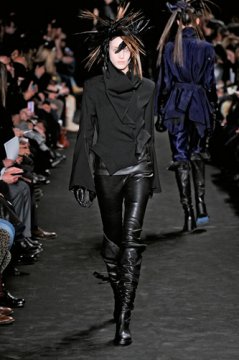 At Ann Demeuleemester, models stormed down the catwalk in origami silhouetted coats and tight leather-based pants, complete with knee-length shoes and topped off with angular, punk-esque hairstyles.