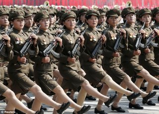 On the go: Members of the North Korean army use ensembles that ELLE mag considers a trend for fall 2013